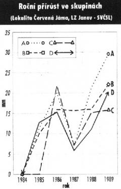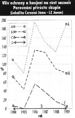 K degresi přírůstu došlo v roce 1987 - jednak vlivem suchého klimatického období a dále vlivem poklesu živinové disponibilní zásoby. K oživení růstu došlo v roce 1988 - 89 po provedeném velkoplošném udržovacím vápnění drceným dolomitickým vápencem, které vyrovnáním hladiny pH na optimální výši 3,5 (výměnné) příznivě působilo na úpravu půdní živinové zásoby jak přirozeného vývoje, tak zbytkového množství tablet.
