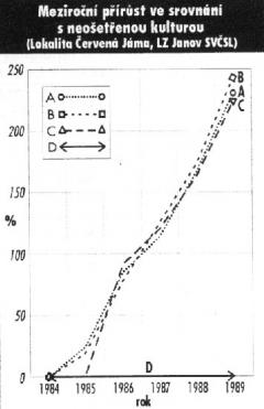 "Meziroční přírůst ve srovnání s neošetřenou kulturou" - graf č. 2 jednoznačně dokumentuje význam ochrany a ošetřování kultur. Jestliže se porovná meziroční přírůst ve skupinách s hodnotou přírůstu na kontrolní ploše, je možné odvodit jednoznačný význam provedených zásahů a to do výše dva a půl násobku výškového přírůstu oproti neošetřené kultuře.