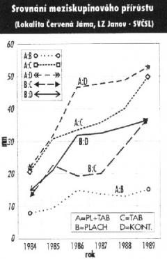 Účinnost hnojivých tablet na přírůst sazenic je patrná z grafu č. 1 "Roční přírůst ve skupinách". Z grafu je patrné, že vliv hnojení se projevil na intenzivním přírůstu v roce 1985 a hlavně v roce 1986, kdy bylo dosaženo maxima. Z provedených měření je průkazné, že přírůst gradoval z výchozího stavu u jednotlivých skupin takto: